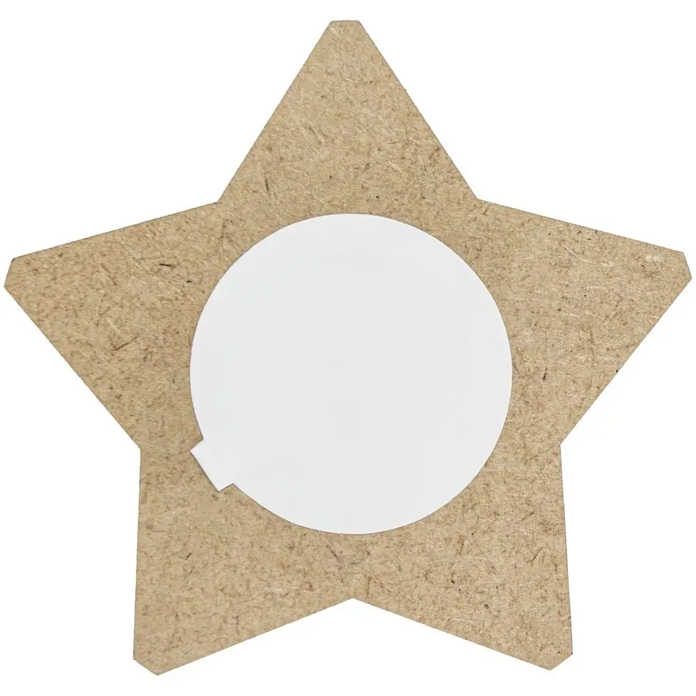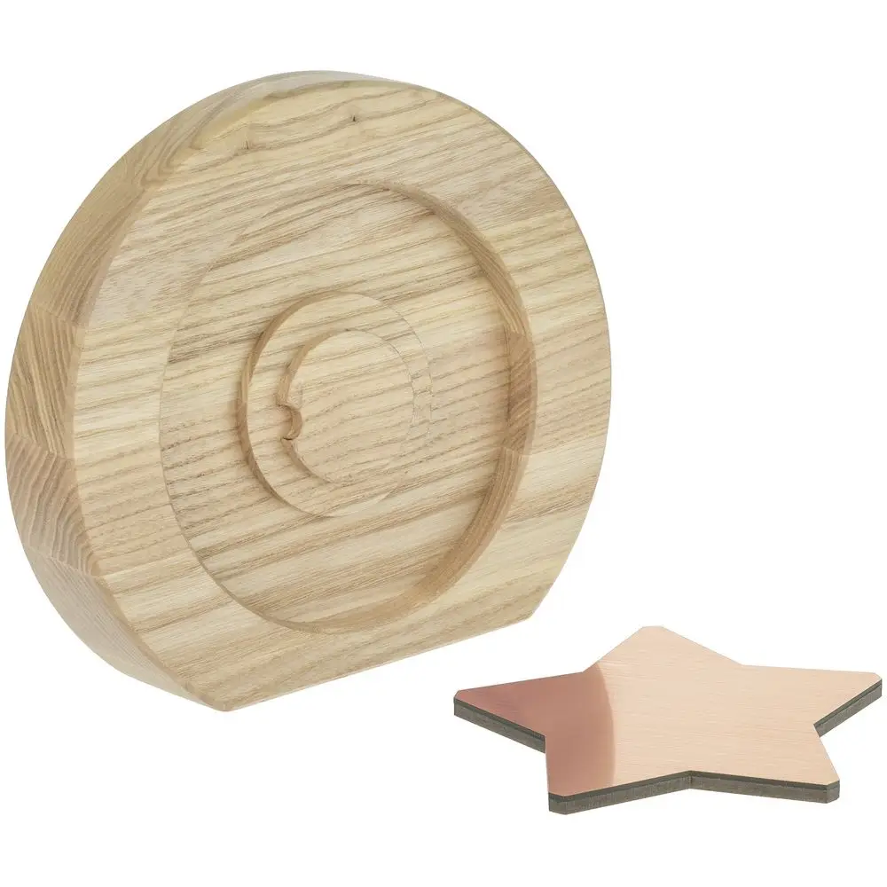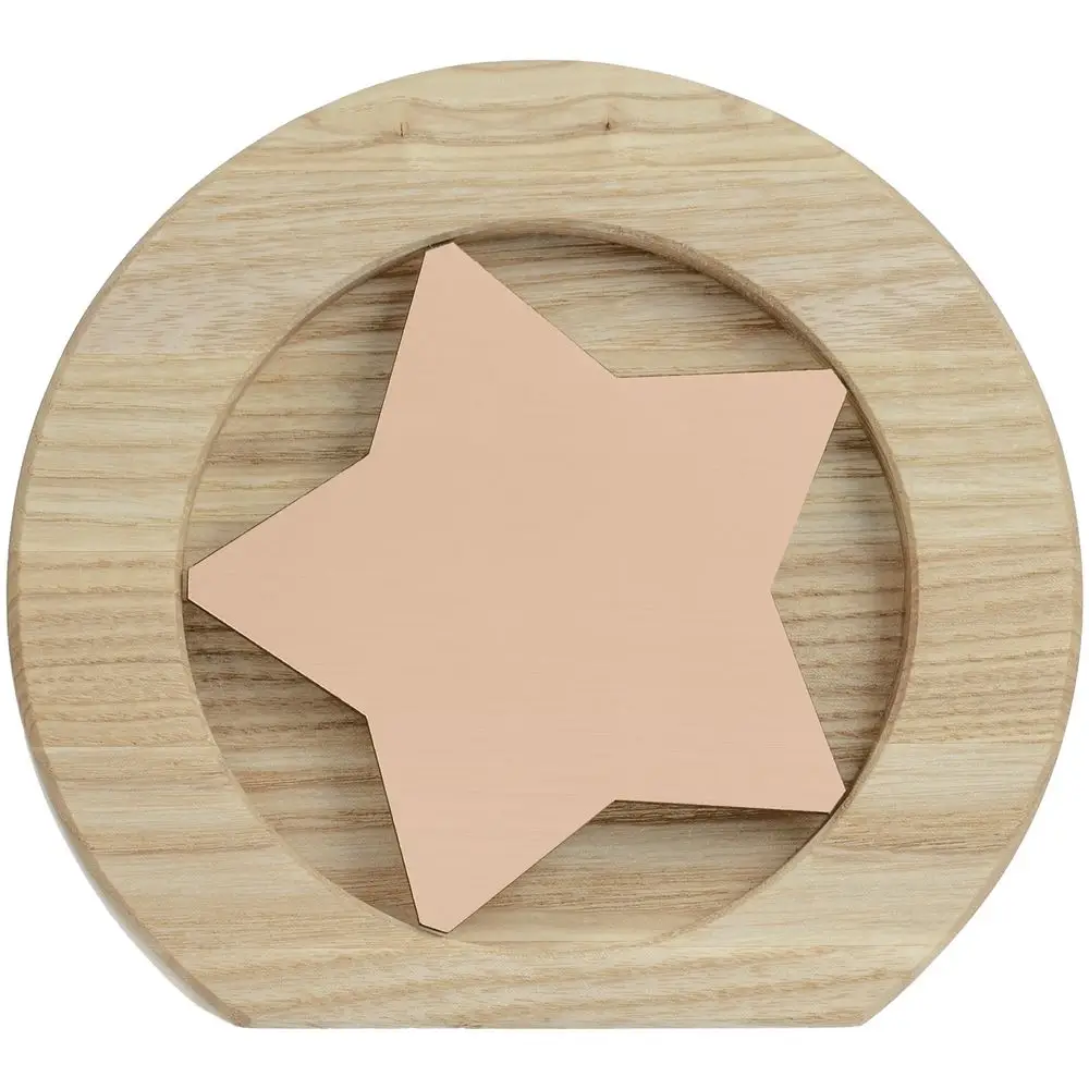 Вставка со звездой из зеркального пластика на деревянной основе крепится на приподнятое основание внутри стелы, что создает объем и многослойность награды. На вставке предусмотрен клеевой слой для крепления после нанесения.