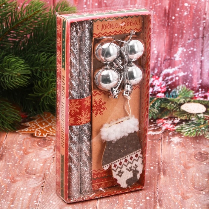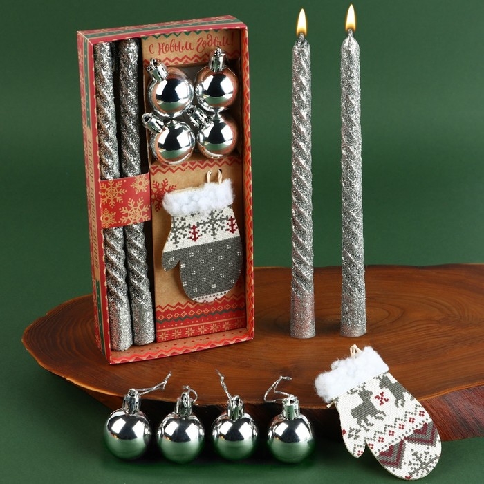 Набор витых свечей с декором прекрасно впишутся в любой новогодний интерьер и создадут праздничное настроение. Такой подарок отлично подойдет для подарка вашим родным и близким, благодаря красивой упаковке. В набор входит 2 античные свечи (1,5 х 1,5 х 20 см.), 4 елочных шара (2,5 х 3,5 см.) и подвеска на елку в виде варежки (5,5 х 0,5 х 8,5 см.)