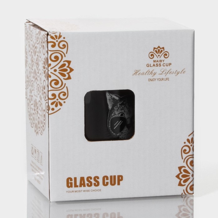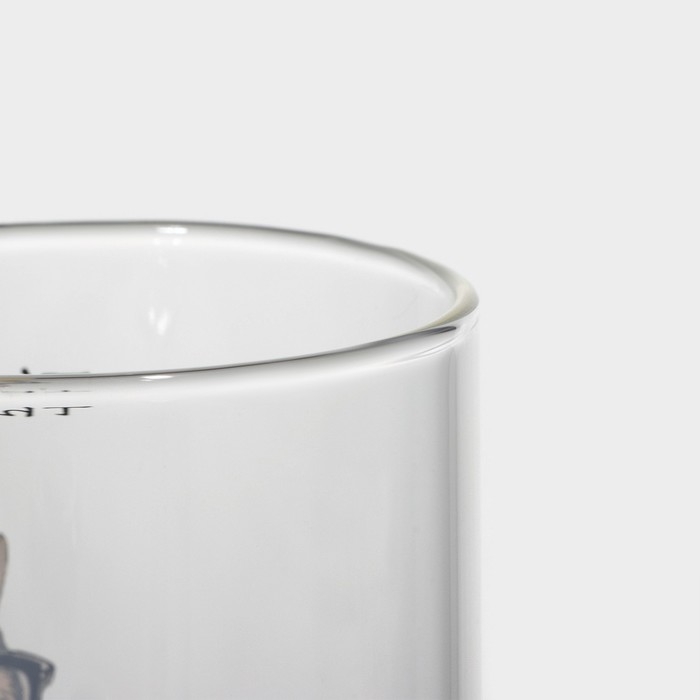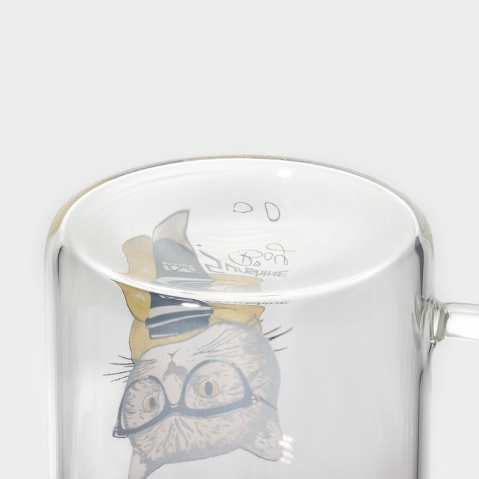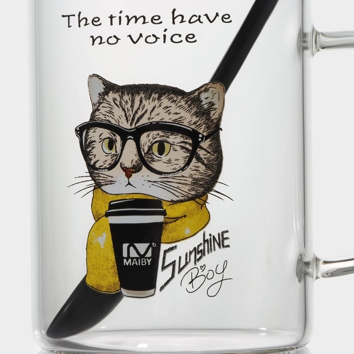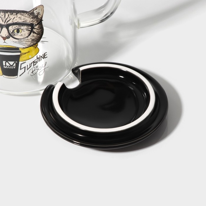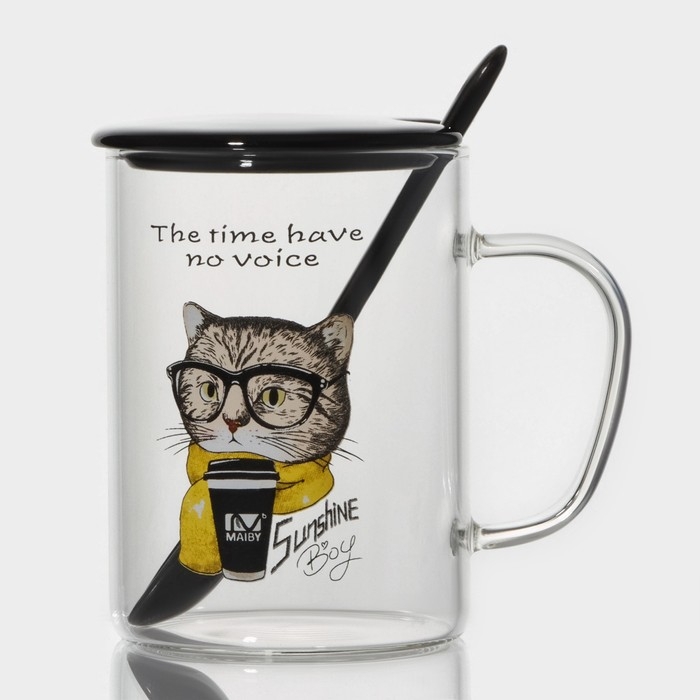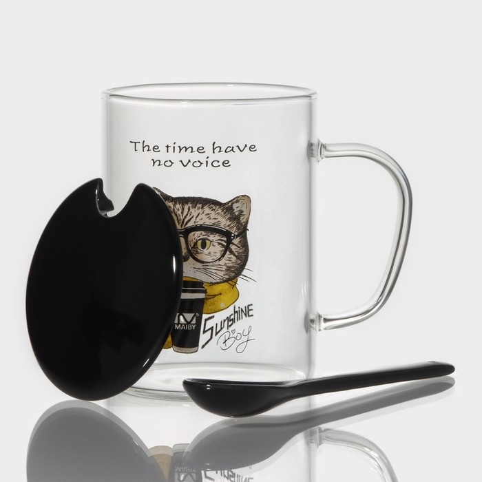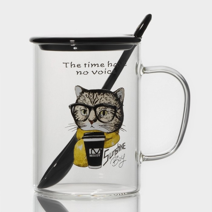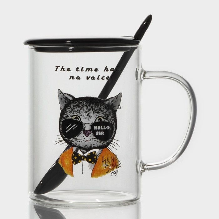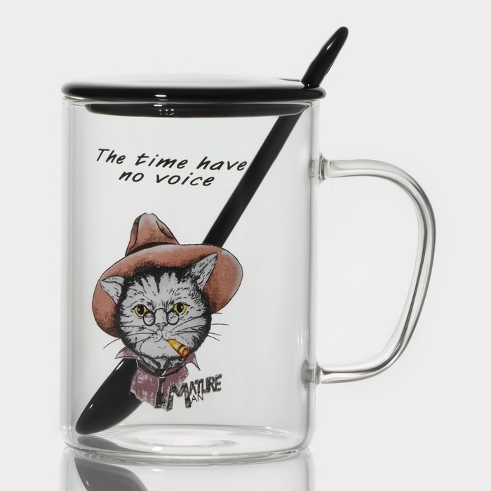 Кружка стеклянная с керамической крышкой и ложкой «Хипстер», 450 мл, рисунок МИКС