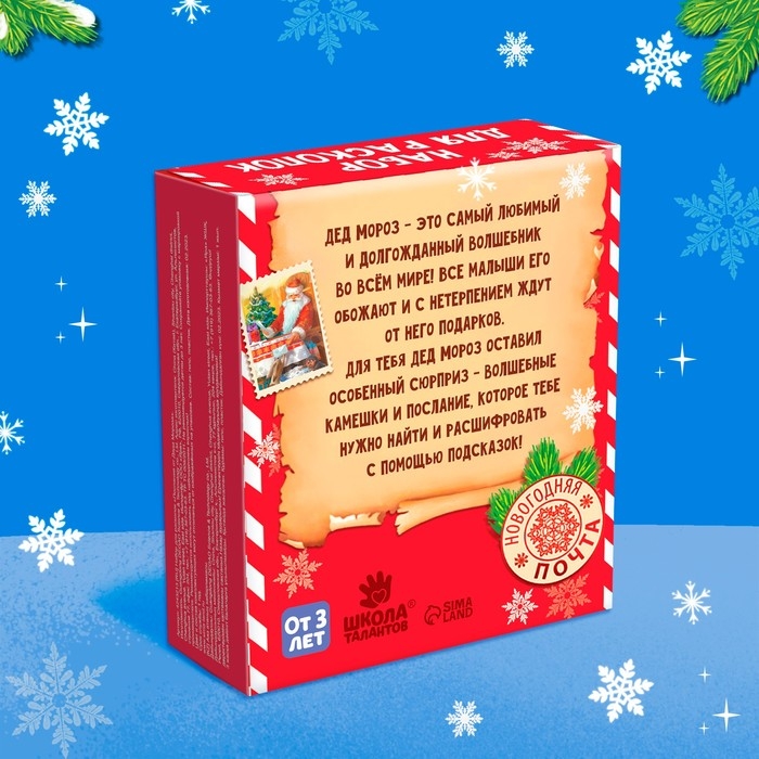 Дедушка Мороз спрятал волшебные камушки и секретное послание, которое предстоит найти и расшифровать с помощью подсказок.