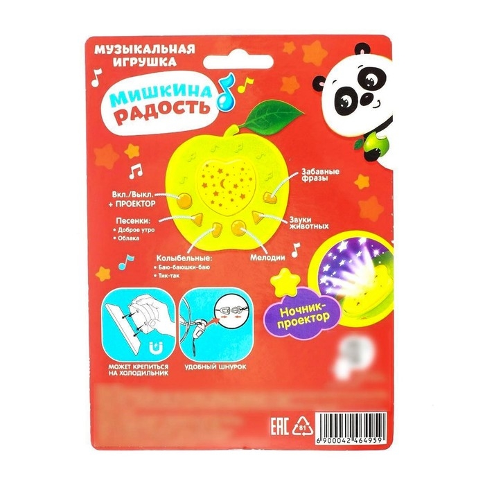 Устройство воспроизводит 2 колыбельные, 2 мелодии, 2 песенки и 3 забавные фразы. А также звуки животных: кошка (мяу), петух (кукареку), собака (лай), коза (бее..), корова ( муу..). Названия животных не проговаривает,только звуки животных.