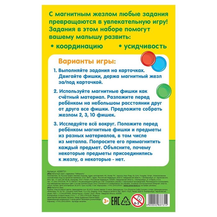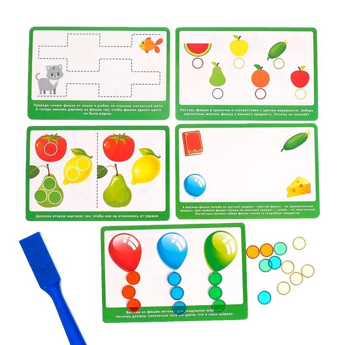 - Выполняйте задания на карточках. Двигайте фишки, держа их магнитным жезлом. Эти упражнения помогут ребёнку развить координацию и усидчивость.