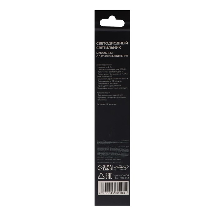 Светильник светодиодный с датчиком движения, 5 LED, 2 Вт, от батареек 3*AAA, 6500К, белый