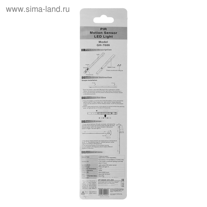 Светильник мебельный светодиодный 4 Вт, 15 LED, Датчик движения, 3xAAA ( не в компл )