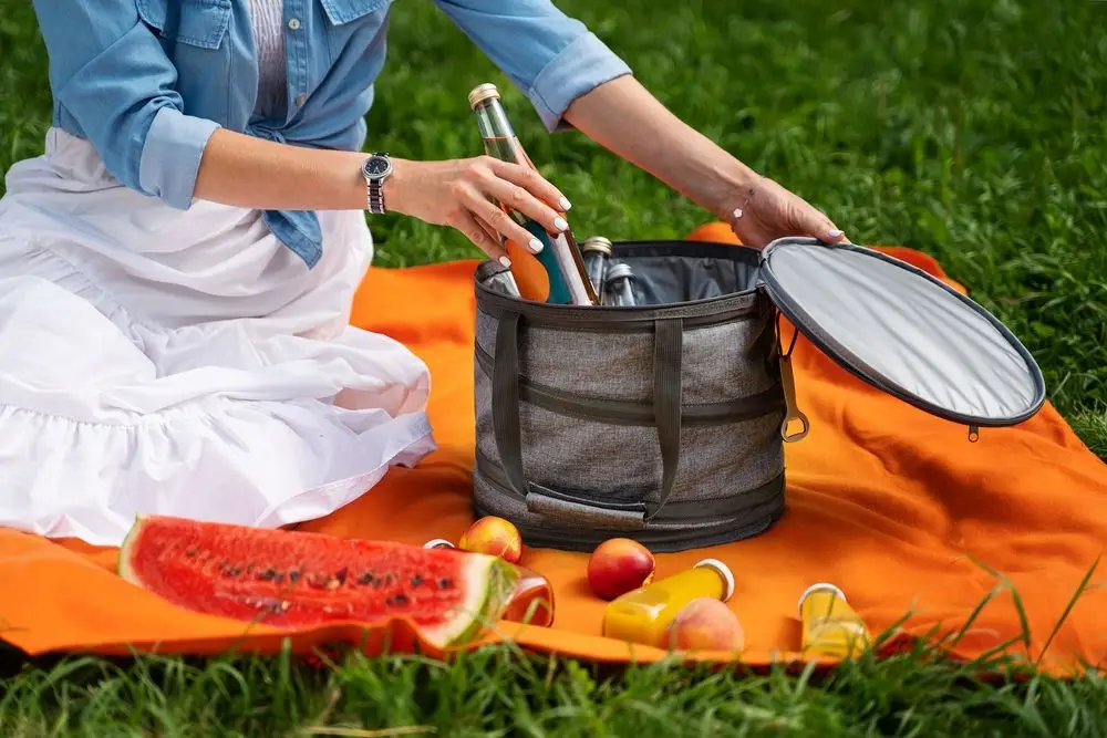 Складная сумка-холодильник с водонепроницаемой подкладкой из ПЭВА. Верхний карман на молнии.