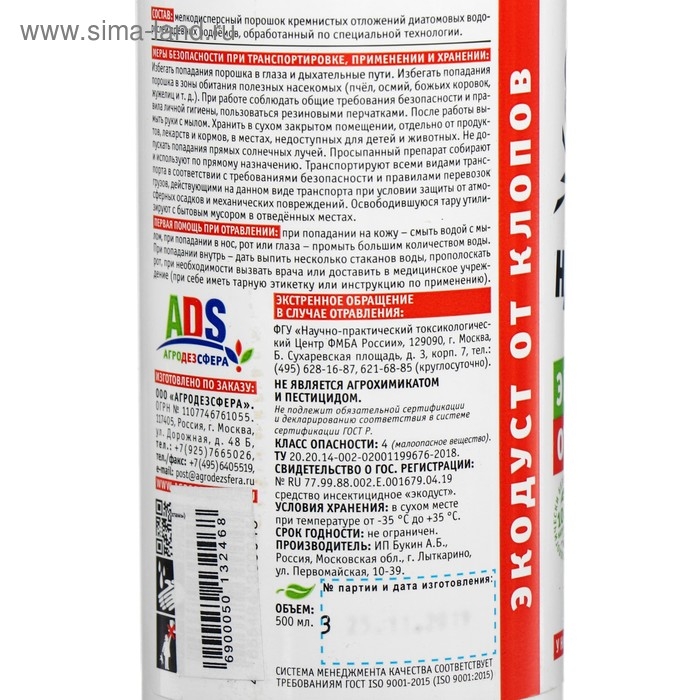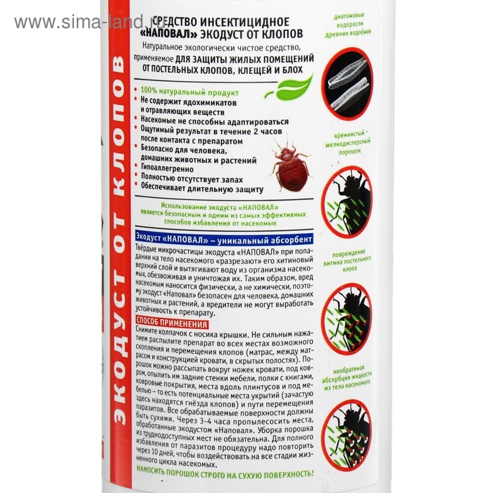 Убивает Наповал Экодуст от клопов – натуральное инсектицидное экологически чистое средство для защиты жилых помещений от постельных клопов, клещей и блох. Использование экодуста является безопасным и одним из самых эффективных способов избавления от насекомых. Твердые микрочастицы препарата при попадании на тело насекомого «разрезают» его хитиновый верхний слой и вытягивают воду из организма насекомых, обезвоживая и уничтожая их. Препарат не содержит ядохимикатов и отравляющих веществ, гипоаллергенно, не имеет запаха, обеспечивает длительный период защиты. Состав: мелкодисперсный порошок кремнистых отложений диатомовых водорослей древних водоемов, обработанный по специальной технологии.Обработка для уничтожения насекомых-вредителей: снять колпачок с носика крышки. Не сильным нажатием распылить препарат во всех местах возможного обитания, скопления и перемещения клопов: матрас, между матрасом и конструкцией кровати, в скрытых полостях, вокруг ножек кровати, под ковром, задние стенки мебели, полки с книгами, ковровые покрытия, места вдоль плинтусов, под мебелью. Все обрабатываемые поверхности должны быть сухими. Через 3-4 часа пропылесосить места, обработанные препаратом, из труднодоступных мест его убирать необязательно. Для полного избавления от паразитов процедуру надо повторить через 10 дней, чтобы воздействовать на все стадии жизненного цикла насекомых.