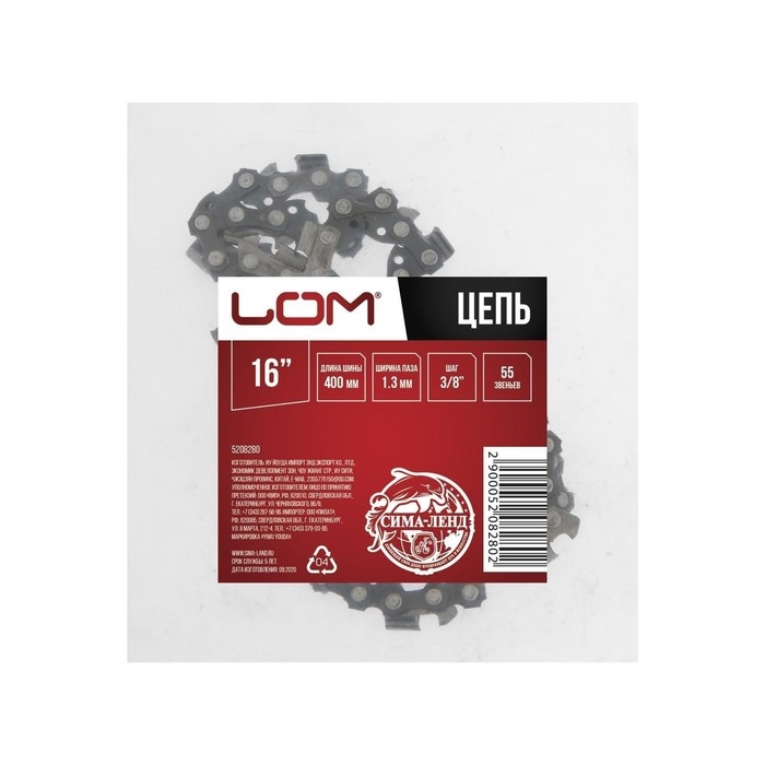 Цепь для бензопилы ЛОМ, 16", 400 мм, ширина паза 1.3 мм, шаг 3/8", 55 звеньев