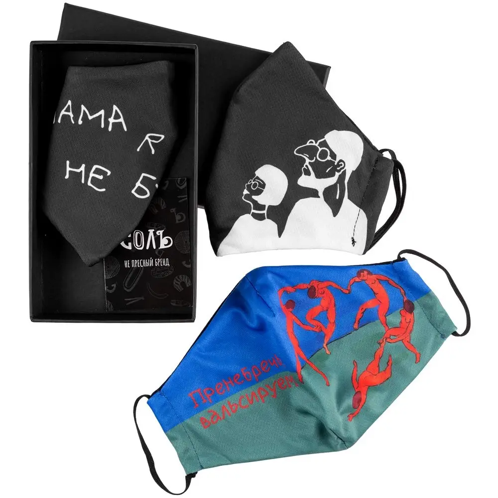 Набор из трех многоразовых масок из дышащей ложной сетки с ярким принтом с гигиенической хлопковой подкладкой и заушниками-резинками.
