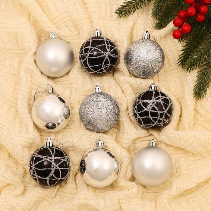 Набор шаров пластик d-6 см, 9 шт "Авива" серебро