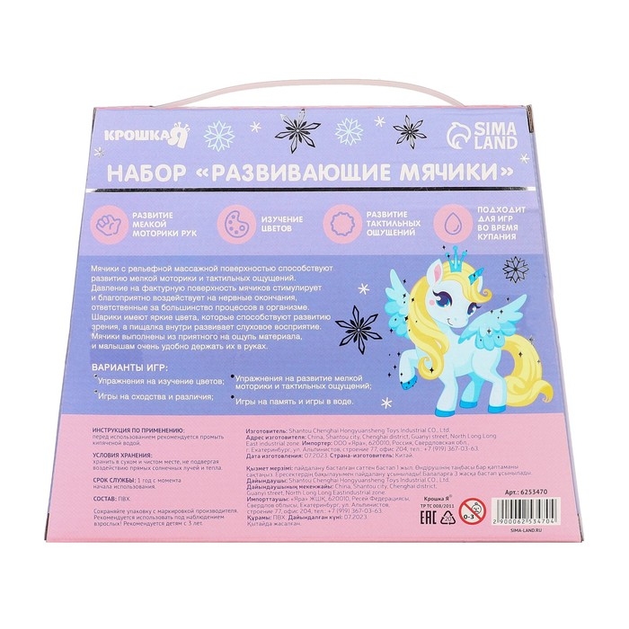 Мячики с рельефной массажной поверхностью способствуют развитию мелкой моторики и тактильных ощущений. Давление на фактурную поверхность мячиков стимулирует и благоприятно воздействует на нервные окончания, ответственные за большинство процессов в организме. Шарики имеют яркие цвета, которые способствуют развитию зрения, а пищалка внутри развивает слуховое восприятие.