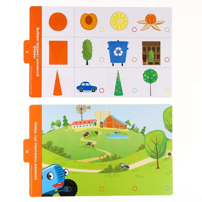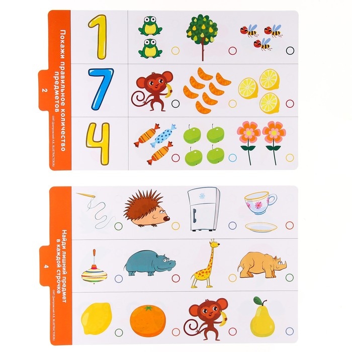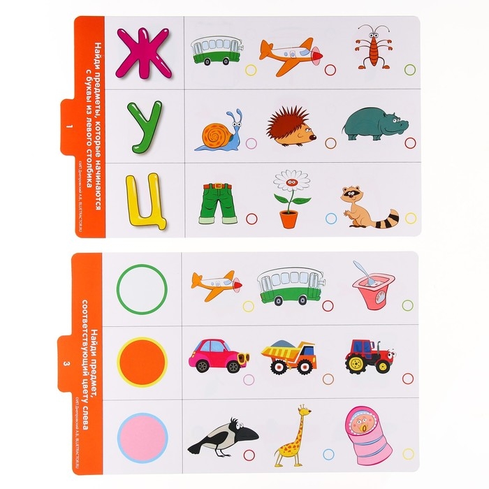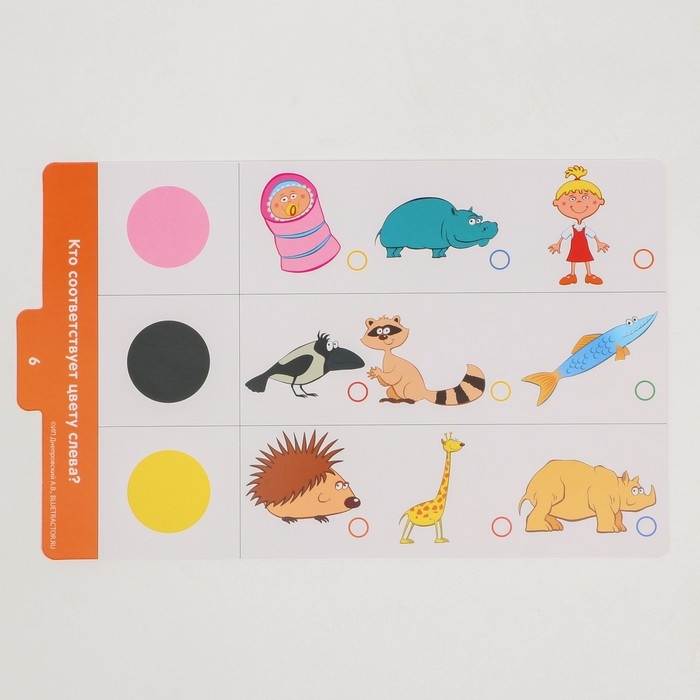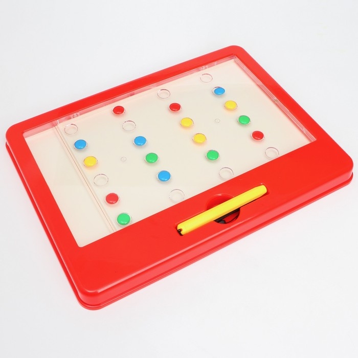 В комплект входит планшет с разноцветными пуговками, ручка-магнит и карточки с заданиями.