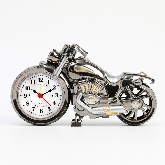 Часы с будильником представлены в оригинальном дизайне в форме мотоцикла, они отлично впишутся в интерьер. Интерьерные часы станут прекрасным декором для дома и дачи, их можно поставить как на прикроватную тумбочку в спальне, детской комнате, гостиной так и на стол или на комод в зале, холле или на кухне. Будильник настольный имеет кварцевый механизм, который гарантирует высокую точность хода. Часы настольные обладают громким будильником, ребенку и вам будет комфортно просыпаться, на работу и в школу. Будильник на батарейках не требует частой замены батареек благодаря экономичному механизму.
