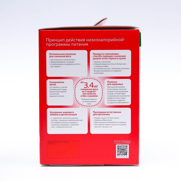 Программа питания специально разработана для тех, кому необходимо снизить вес и уровень холестерина в крови. В меню входят как хорошо знакомые вегетарианские блюда, так и специально разработанные наименования. Это сытное питание с энергетической ценностью базового рациона 377–425 ккал в день, помогающее ликвидировать лишние килограммы и снизить уровень холестерина. По результатам оценки клинического использования программы «Худеем за неделю» среднее снижение веса составило 3.4 кг за 14 дней.