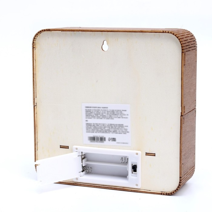 Изделие выполнено из экологичного материала — дерева и работает от батареек.