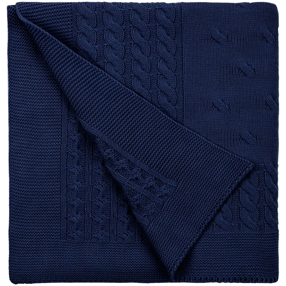Модель: однотонный плед с фактурной вязкой, которая позволяет сделать его воздушным и объемным. Чередуя различные типы петель на гладком полотне, можно вывязать любую графику — логотип, текст, товарный знак.