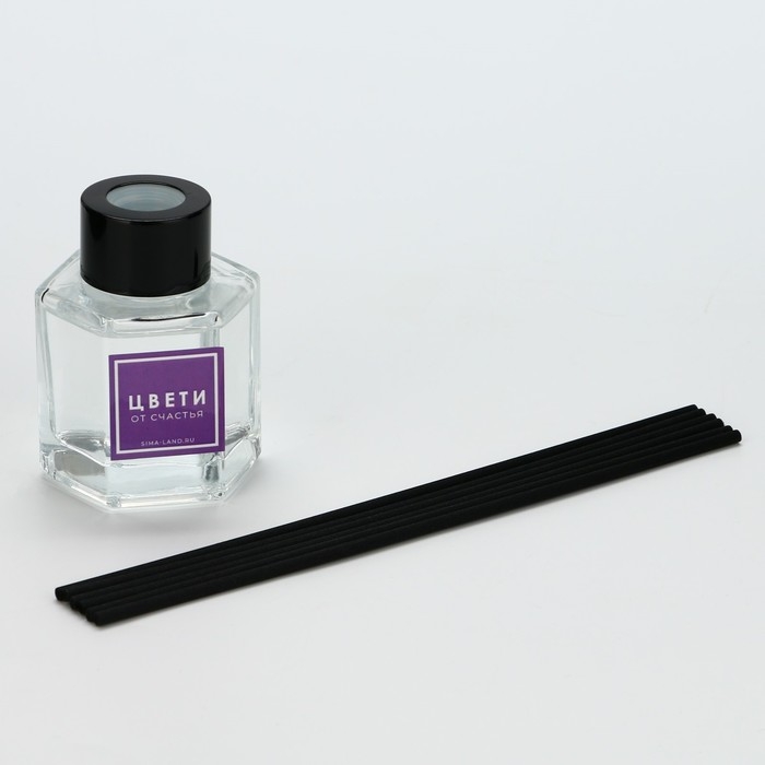 Диффузор выполнен в стильном дизайне, с флаконом из прозрачного стекла и крышкой черного цвета, в комплект входят палочки из черного цвета, объемом 50 мл.