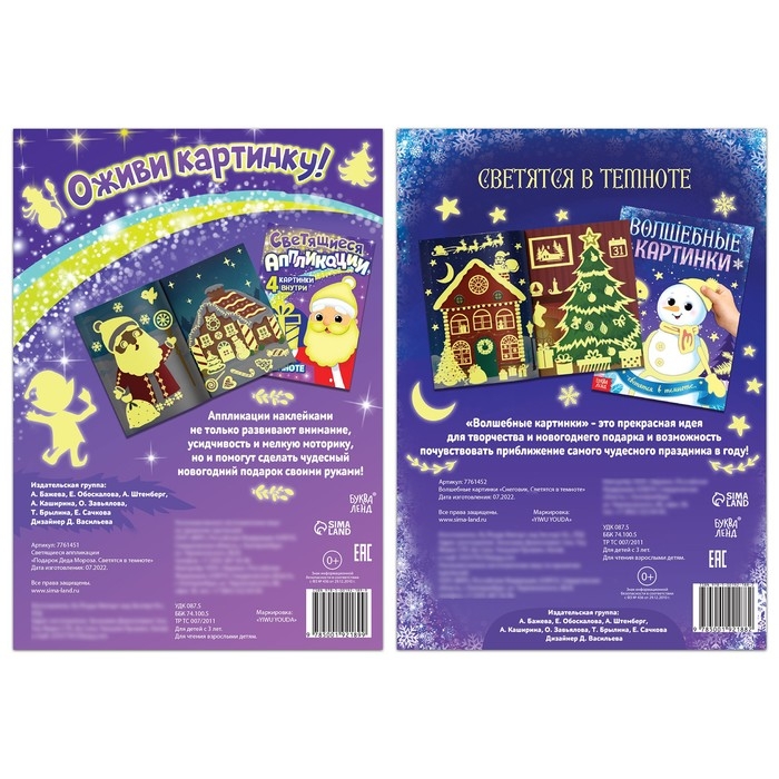 - В каждом издании ребёнок найдёт по 4 заготовки для аппликаций, 4 странички со светящимися наклейками и примеры, что должно получиться в итоге.
