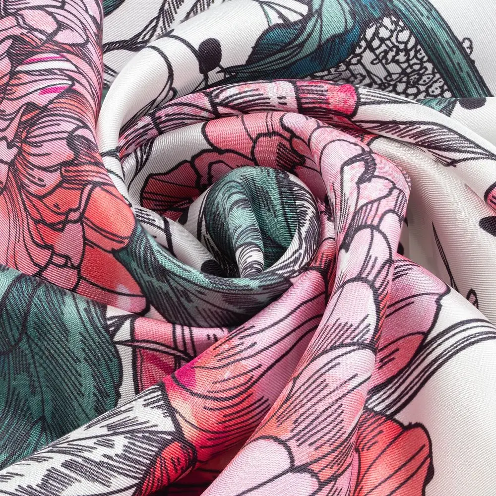 Шелковый платок с цветочным принтом открывает простор фантазии — его можно использовать как шарф, головной убор или декоративный элемент для верхней одежды и аксессуаров.