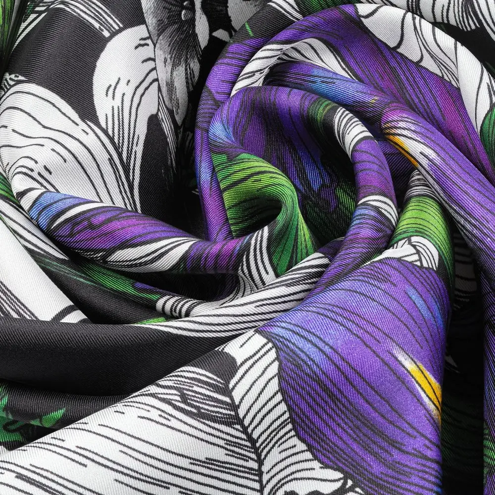 Шелковый платок с цветочным принтом открывает простор фантазии — его можно использовать как шарф, головной убор или декоративный элемент для верхней одежды и аксессуаров.