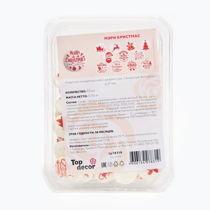 Сахарные медальоны Top decor, "Мэри Кристмас", 27 мм, набор 63 шт.
