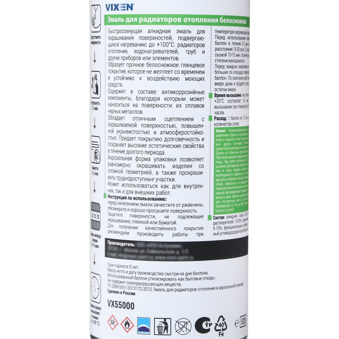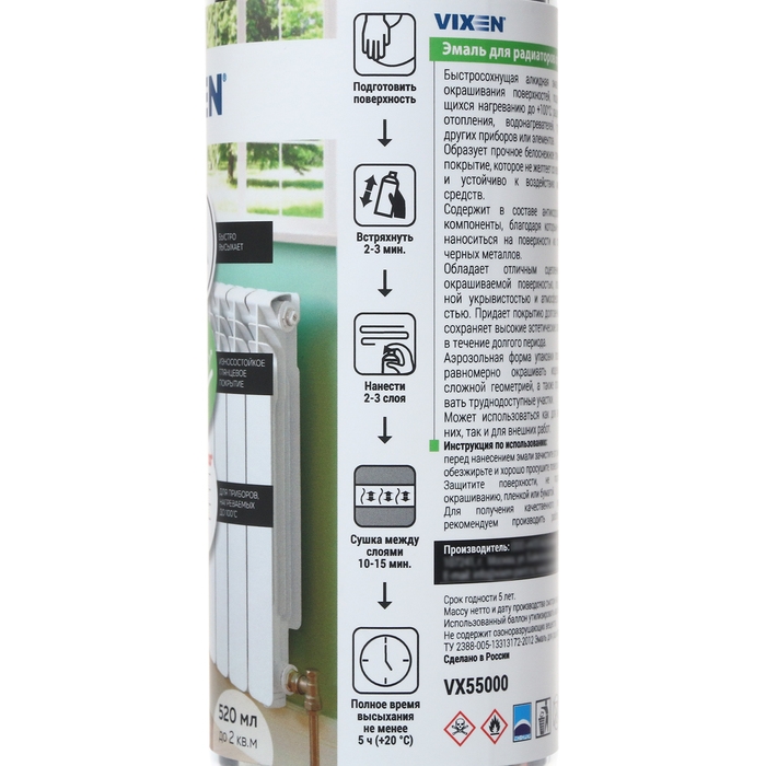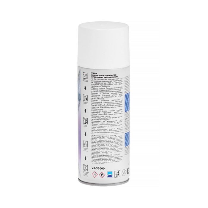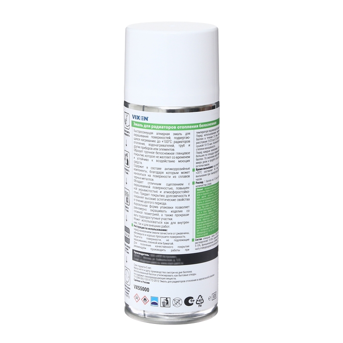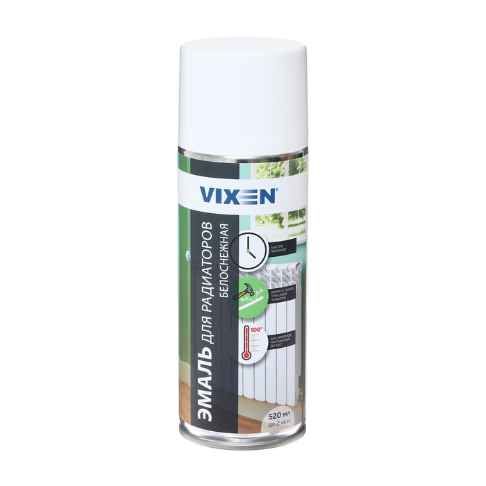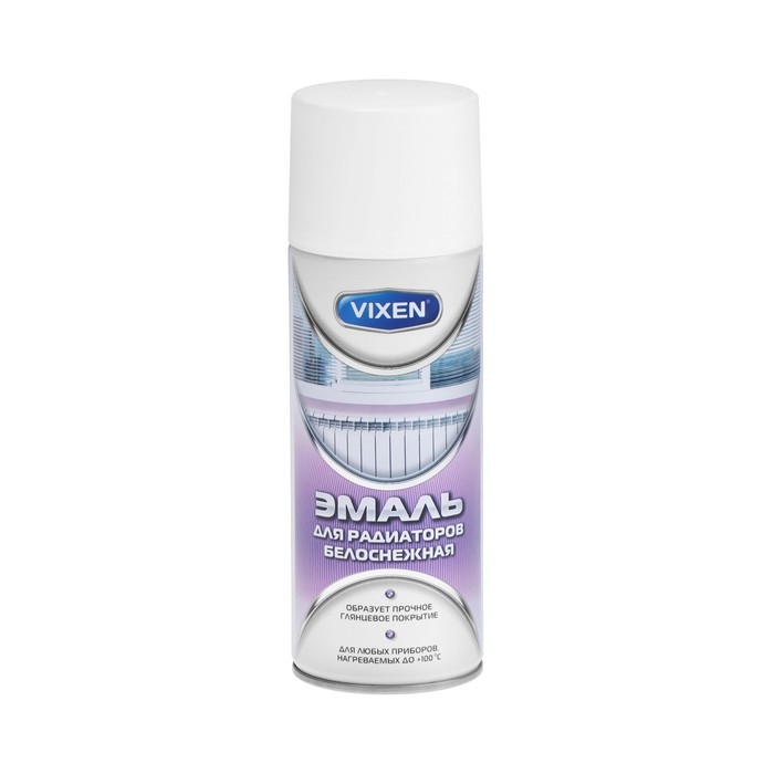 Быстросохнущая алкидная эмаль VIXEN для окрашивания поверхностей, подвергающихся нагреванию до +100 °С: радиаторов отопления, водонагревателей, труб и других приборов или элементов. Образует прочное белоснежное глянцевое покрытие, которое не желтеет со временем и устойчиво к воздействию моющих средств. Содержит в составе антикоррозийные компоненты, благодаря которым может наносится на поверхности из сплавов чёрных металлов. Обладает отличным сцеплением с окрашиваемой поверхностью, повышенной укрывистостью и атмосферостойкостью. Придаёт покрытию долговечность и сохраняет высокие эстетические свойства в течение долгого периода. Аэрозольная форма упаковки позволяет равномерно окрашивать изделия со сложной геометрией, а также прокрашивать труднодоступные участки. Может использоваться как для внутренних, так и для внешних работ.