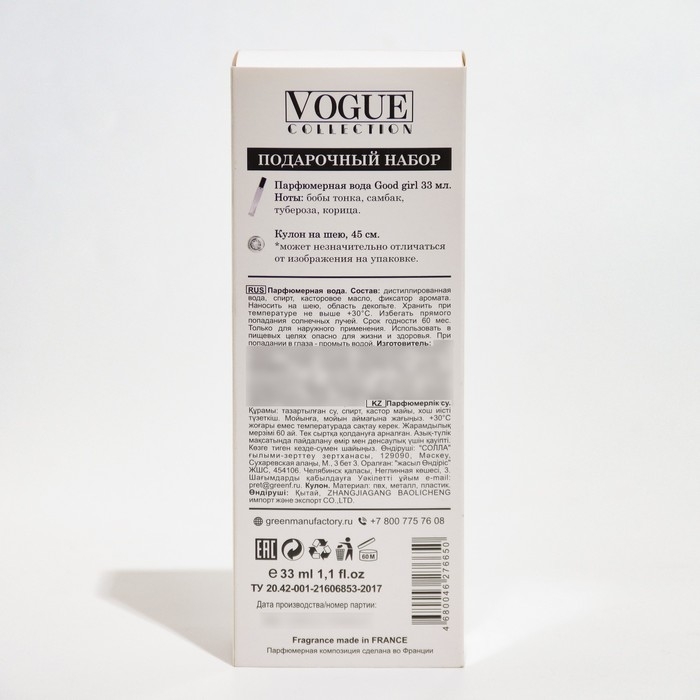 Подарочный набор косметики женский "Good girl", кулон+парфюмерная вода, 33 мл