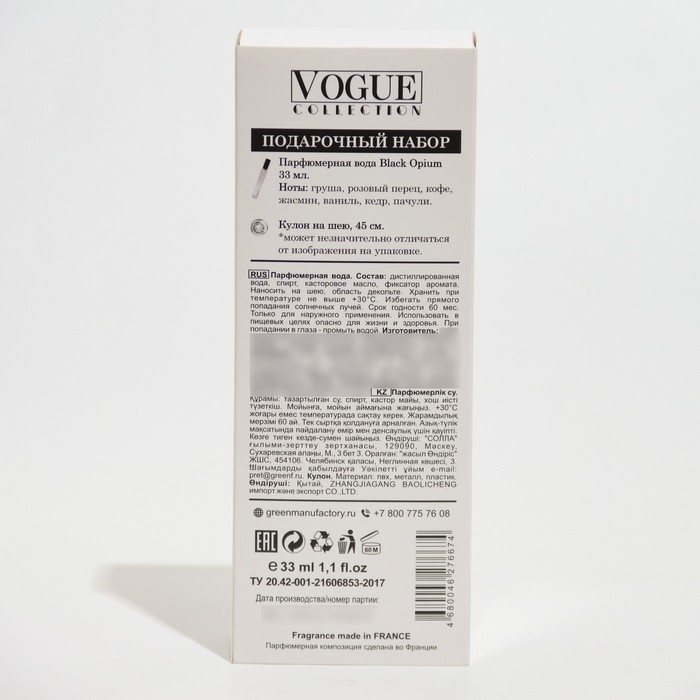 Подарочный набор косметики женский "Black Opium", кулон+парфюмерная вода, 33 мл