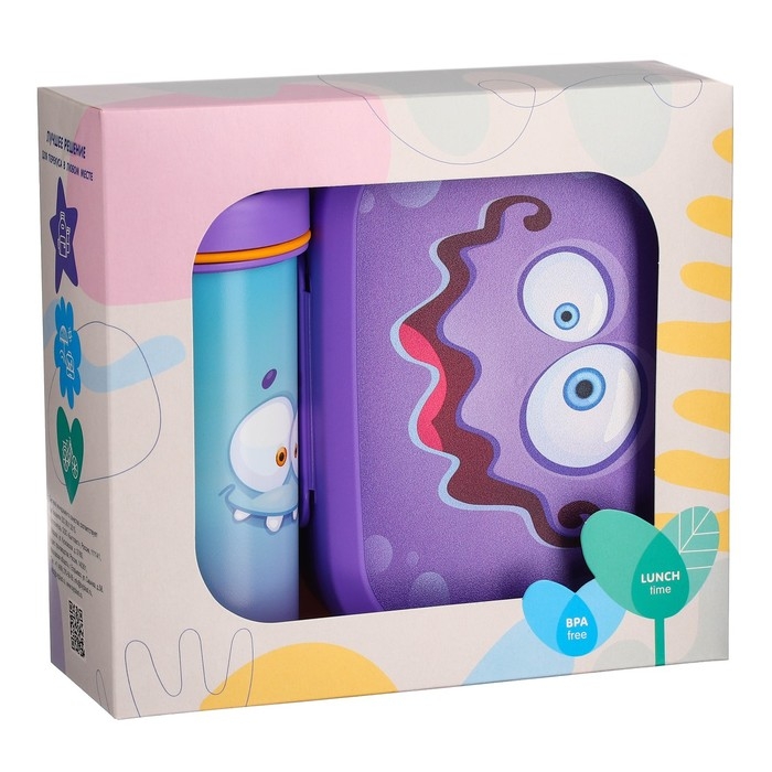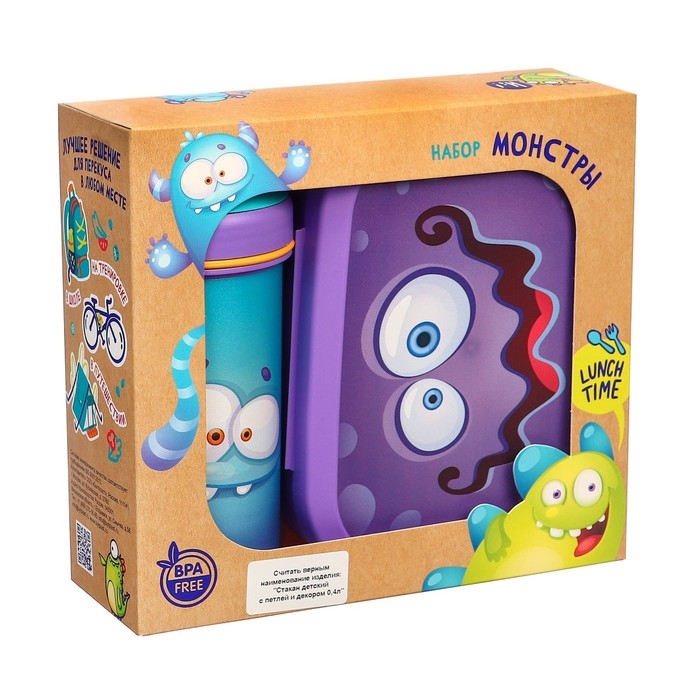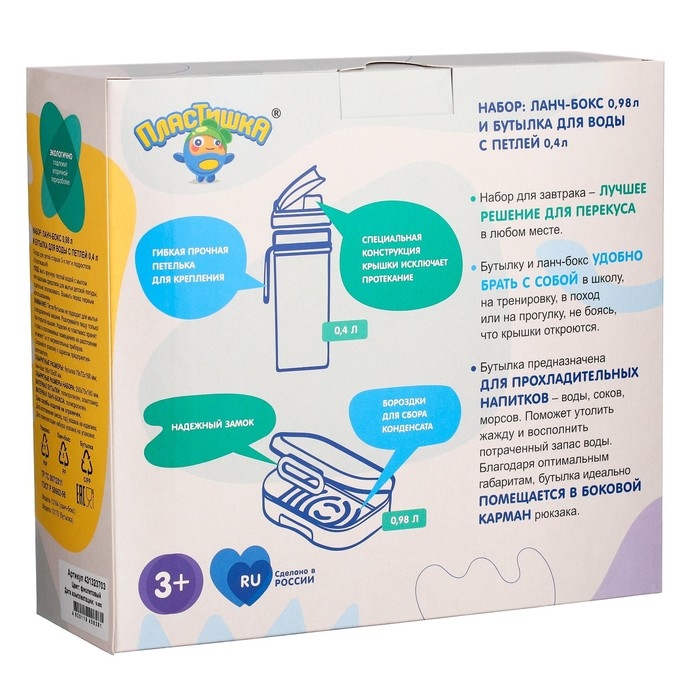 Набор для завтрака "Пластишка" - лучшее решение для перекуса в любом месте. Бутылку и ланч-бокс удобно брать с собой в школу, на тренировку, в поход или на прогулку. Бутылка предназначена для прохладительных напитков - воды, соков, морсов. Поможет утолить жажду и восполнить потраченный запас воды. Специальная конструкция крышки исключает протекание.