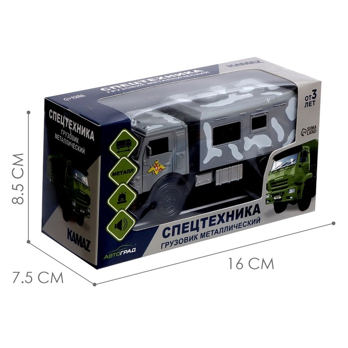 Лицензионная модель КамАЗ «Автоград» — детально проработанный транспорт спецслужб. Машинка дополнит игрушечный автопарк и станет прекрасным подарком для маленького любителя техники.