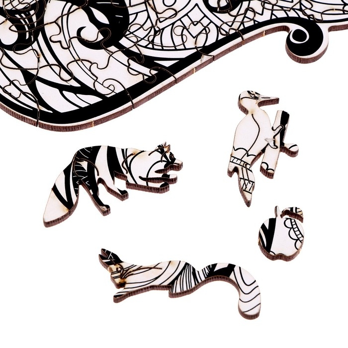- Каждая деталь в наборе — это отдельная фигурка. Все они изготовлены из дерева, тщательно обработаны и не имеют заусенцев. Поэтому собирать такой пазл приятно и удобно.