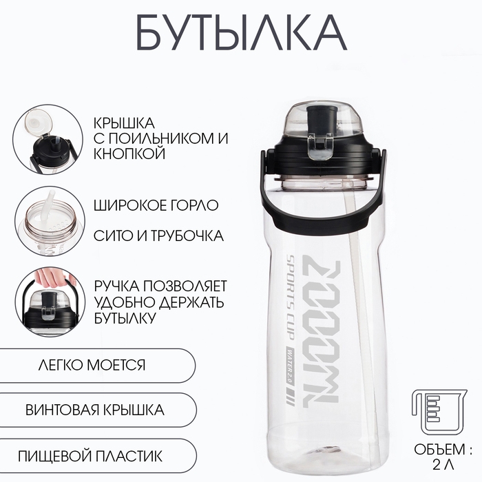Она изготовлена из качественного и безопасного пластика. Бутылка оснащена крышкой с кнопкой, которая обеспечивает герметичность и предотвращает протекание. Трубочка обеспечит комфортное питье, а встроенное сито позволит вам добавлять любимые ягоды или фрукты, создавая уникальные вкусовые комбинации. С помощью ручки бутылку можно легко и комфортно носить с собой.