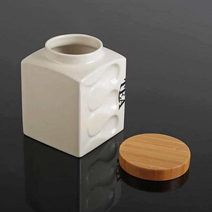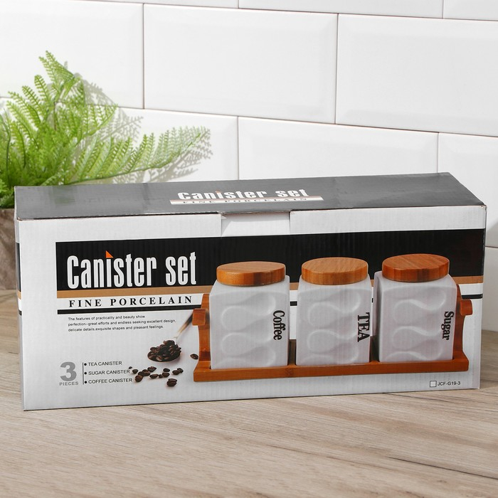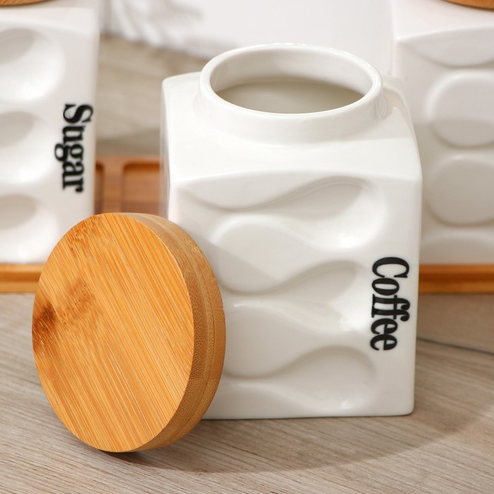 Банки для хранения сыпучих продуктов на деревянной подставке «Эстет. Волны», 3 предмета: 900 мл, 12×14,5 см, керамические, цвет белый