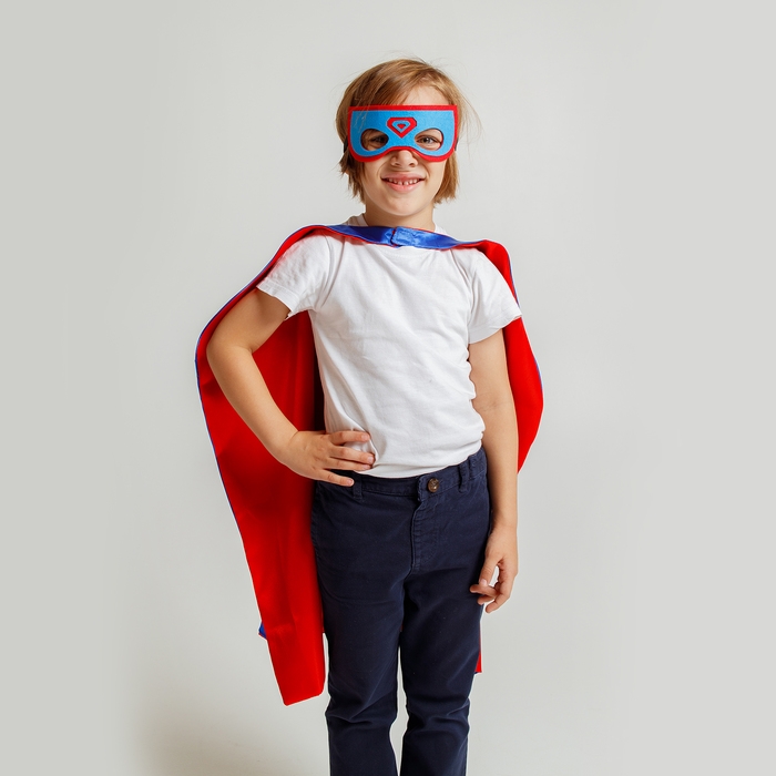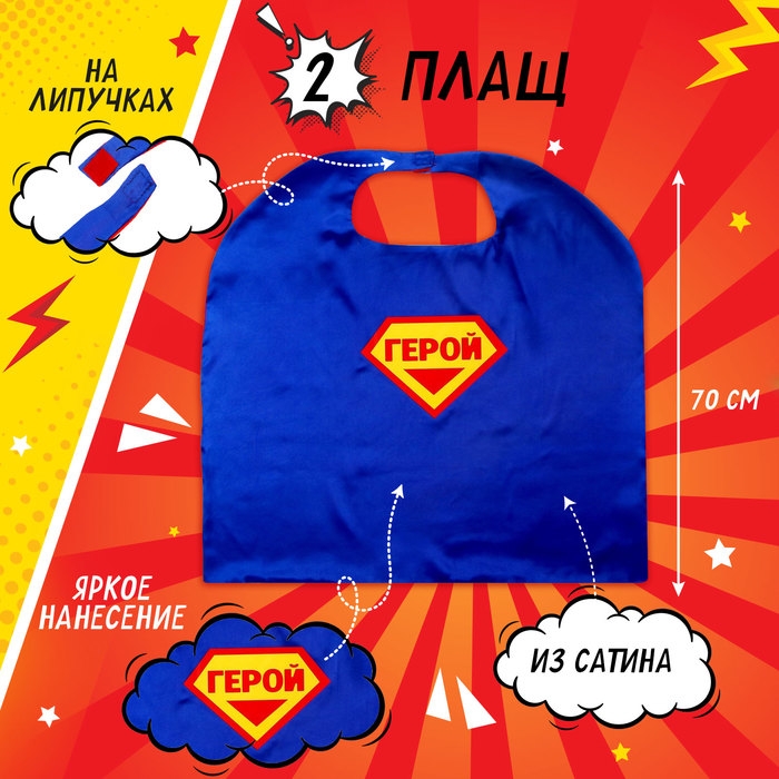 - Яркий плащ: выполнен из мягкого сатина, которые обеспечивает комфорт при носке. Длина плаща 70 см, подойдёт для детей разного возраста. Плащ легко надевается и фиксируется на липучках.