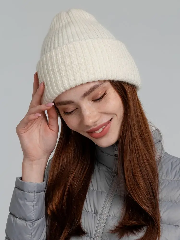 Однослойная шапка фактурной вязки. Высота отворота регулируется самостоятельно.