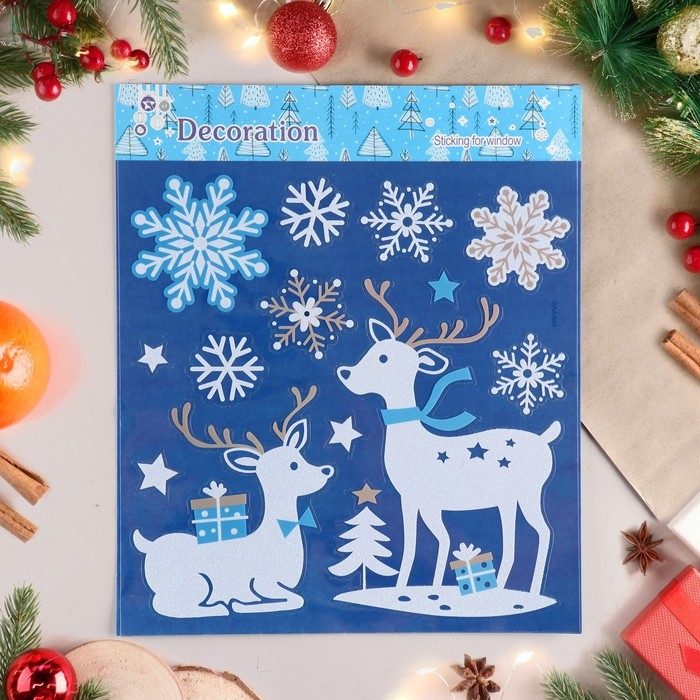 Наклейки на окна "Новогодние" пара оленей, синий фон, 38х30 см