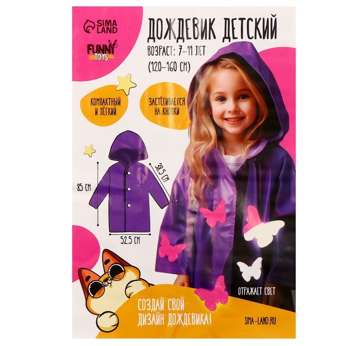 - Размер дождевика рассчитан на детей ростом от 120 до 160 см.