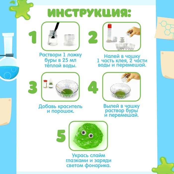 Набор для опытов «Светящийся слаймик» позволит ребёнку провести увлекательный химический эксперимент и создать необычный слайм своими руками.