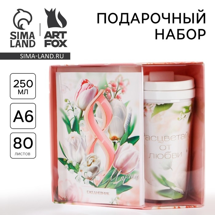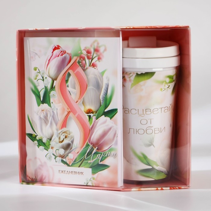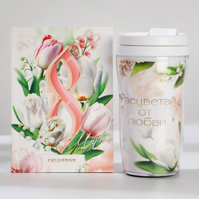 Подарочный набор: ежедневник А6 80 листов и термостакан 250 мл «Расцветай от любви»