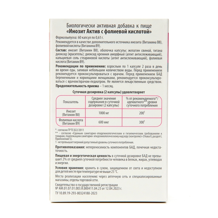 Витамины для женщин Инозит Актив с фолиевой кислотой, 60 капсул по 0,61 г