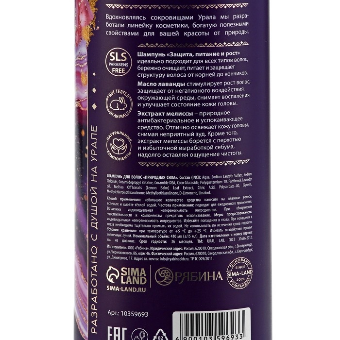 Шампунь для волос с экстрактом мелиссы, защита, питание и рост, 410 мл, URAL LAB