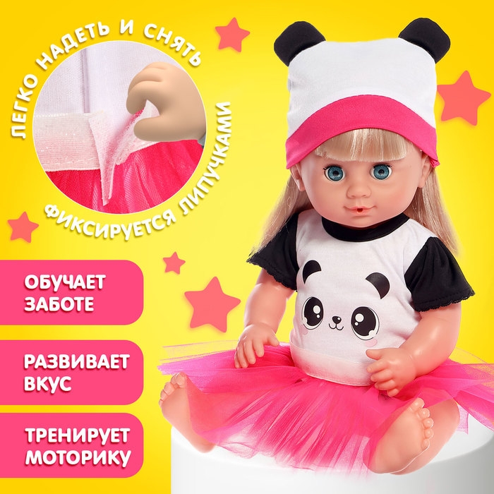Маленькие леди переодевают любимых пупсиков несколько раз в день. Ведь для разных случаев пупсу нужен соответствующий дресс-код. Одежда для пупсов «Панда» — это милый и практичный комплект, включающий боди, юбочку и шапку.