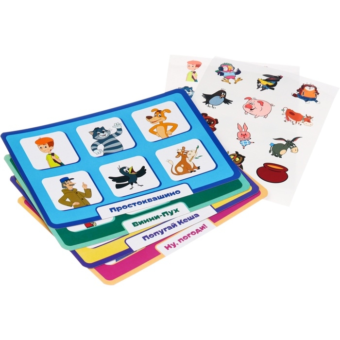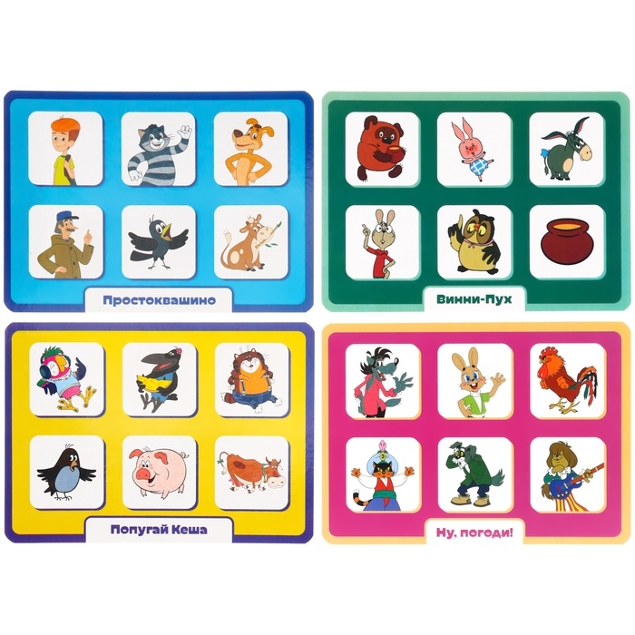 «С любимыми героями» — лото для детей от 3 лет. Увлекательная настолка погрузит малыша в мир чудес, где живут персонажи любимых советских мультфильмов. Яркие и красочные картинки привлекут внимание ребёнка надолго и поднимут настроение. Цель игры — быстрее других закрыть все окошки на карточке фишками.