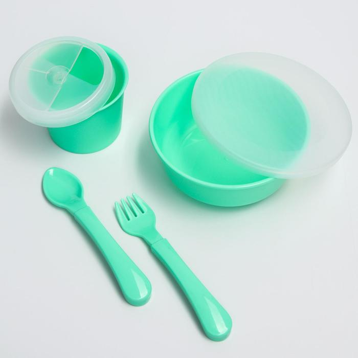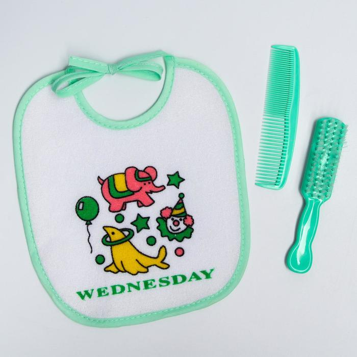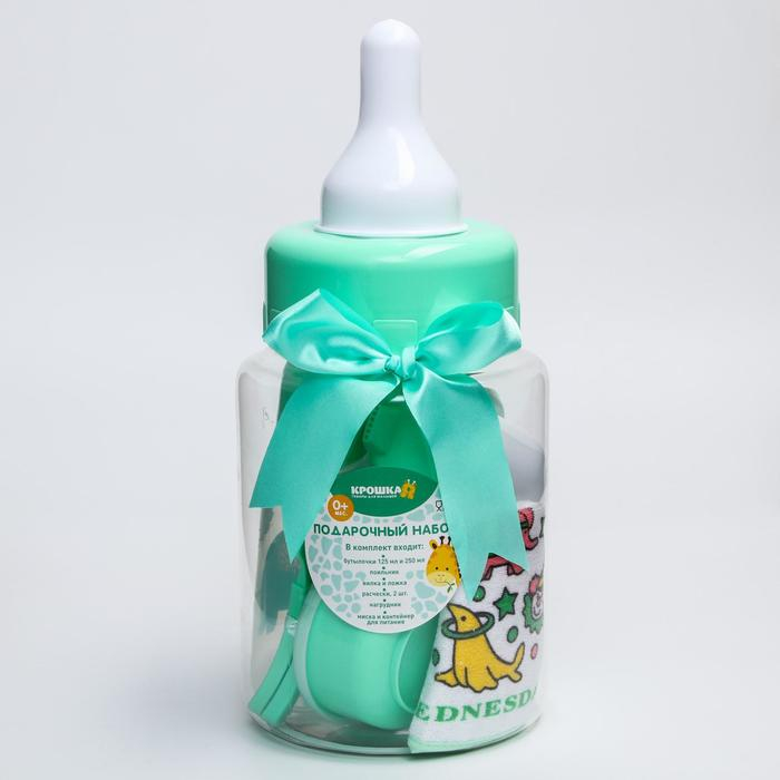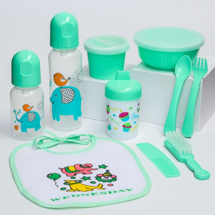 Набор детский «Первый подарок малышу», 10 предметов: бутылочки для кормления 150 и 250 мл, поильник, посуда, нагрудник, расчёска, щётка, цвет зелёный