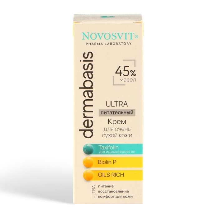ULTRA Питательный крем 45% масел для очень сухой кожи обладает плотной насыщенной текстурой, при легком массировании высвобождает комплекс масел, мгновенно успокаивает повреждённую, сухую кожу. Комбинация Дигидрокверцетина, пребиотика Biolin P и комплекса питательных масел заметно улучшает состояние кожи, восстанавливает её барьерную функцию, препятствует потере эластичности, способствует уменьшению покраснений. Интенсивно питает, возвращает коже чувство комфорта и придает сияние коже.