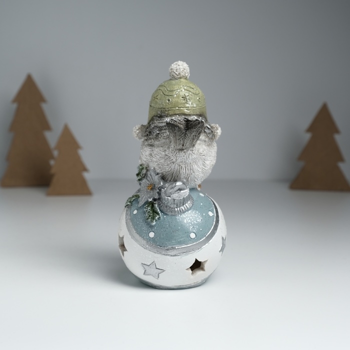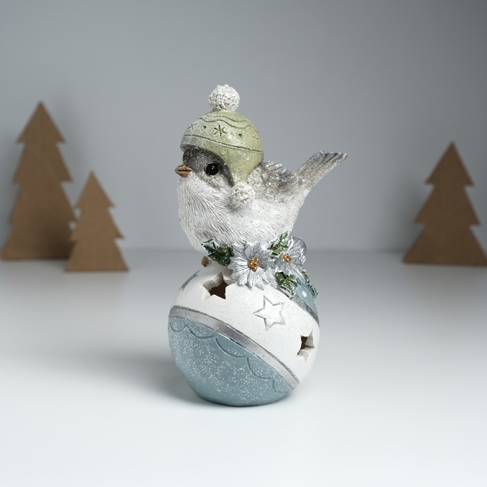 Сувенир полистоун свет "Воробышек в шапке сидит на новогоднем шарике" серый 7,6х9,5х15 см