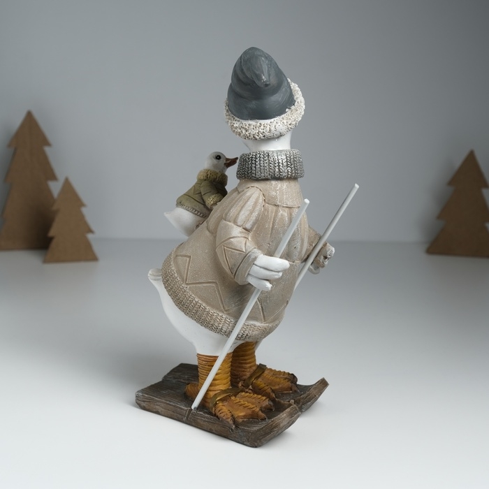 Сувенир полистоун "Гусь на лыжах, с гусёнком на спине" серо-бежевый 9,5х13,5х23,5 см