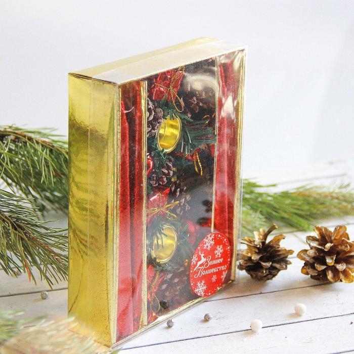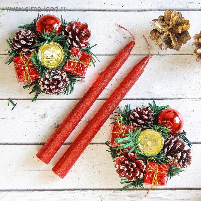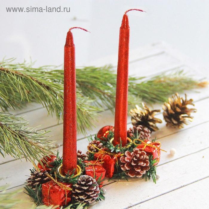 Свеча новогодняя с подсвечником "Красные шишки и подарки" (набор 4 шт) 4х13х17 см, красный
