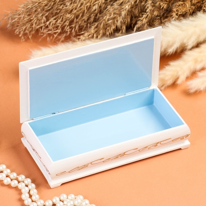 Шкатулка изготовлена из дерева, покрыта краской. Заранее напечатанное изображение приклеено и покрыто лаком. Дополнительно мастер наносит узор.