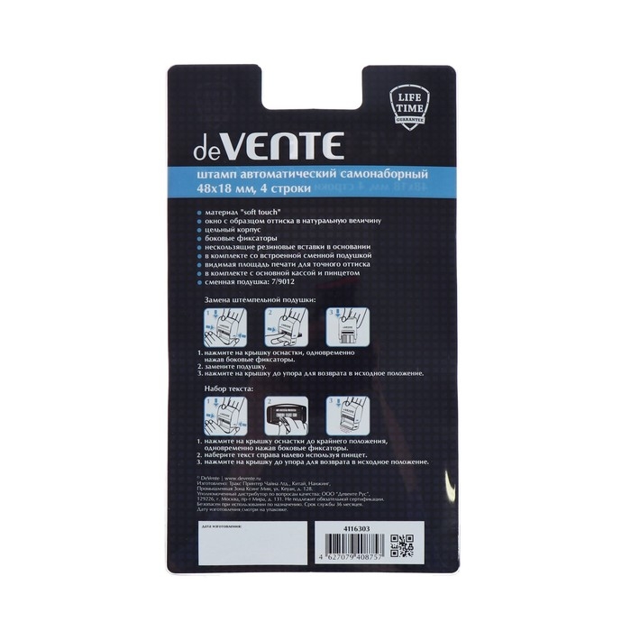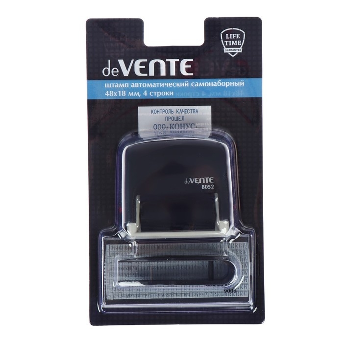 Штамп автоматический самонаборный "deVENTE" 8052, 4-х строчный, 48x18 мм, в комплекте с основной и дополнительной кассами и пинцетом, в блистере.