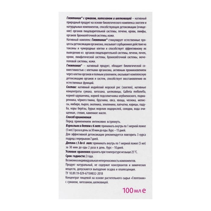Глеятоник с сумахом, хитозаном и шелковицей – нативный природный продукт на основе биологического комплекса зооглеи и натуральных компонентов, способствующий детоксикации органов пищеварительной системы, печени, крови, лимфы, органов бронхолёгочной системы, кожи.